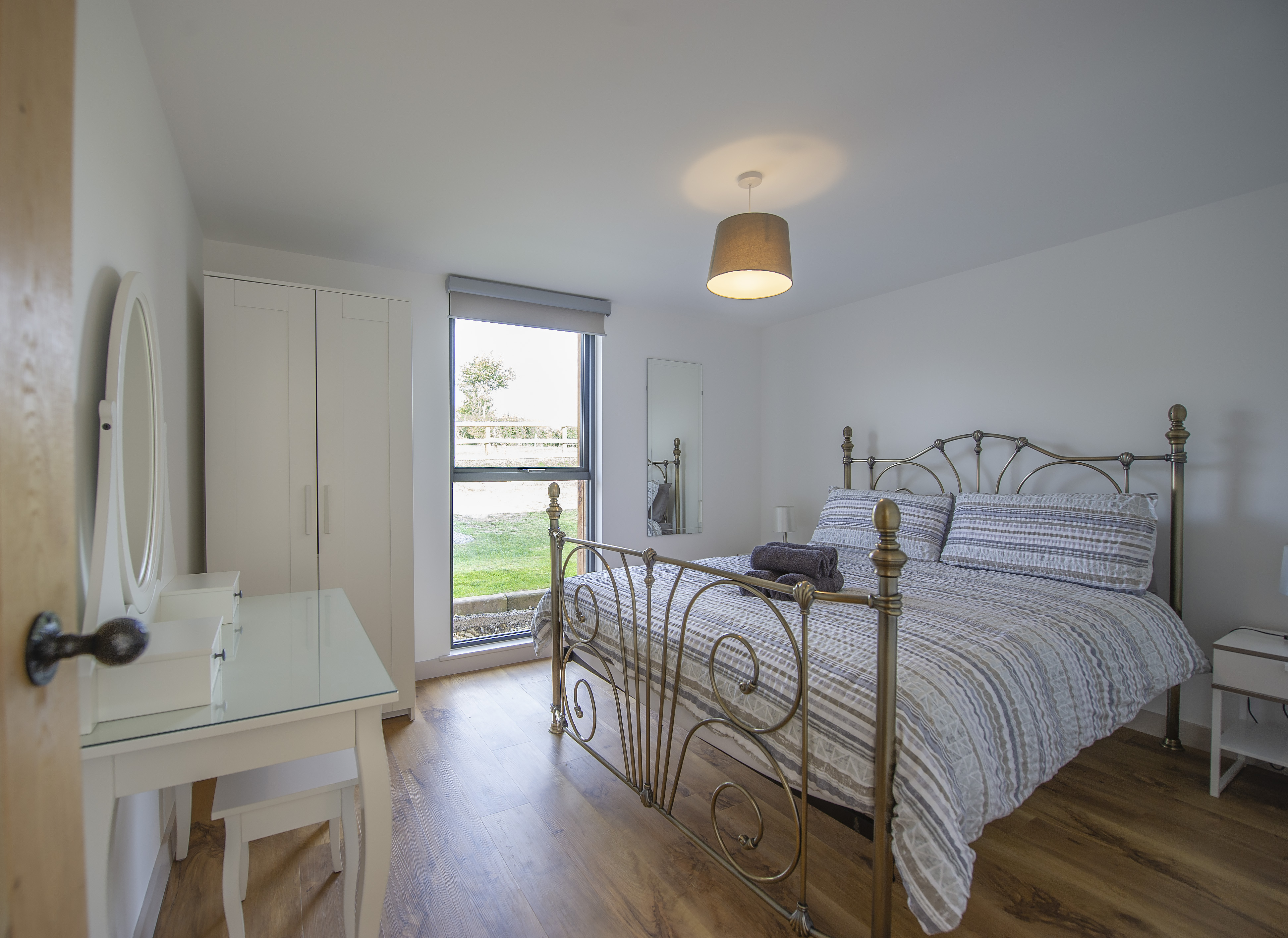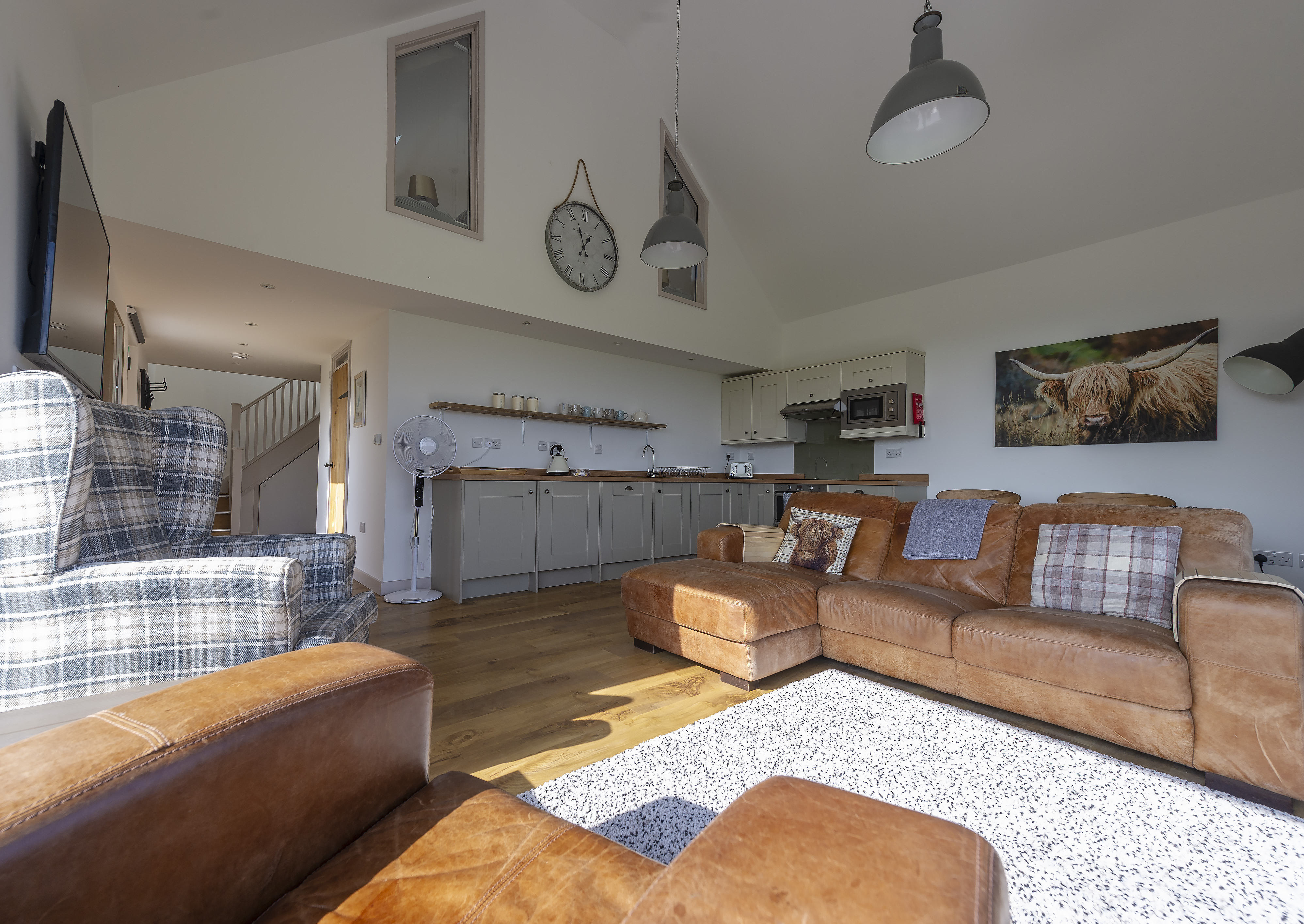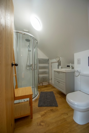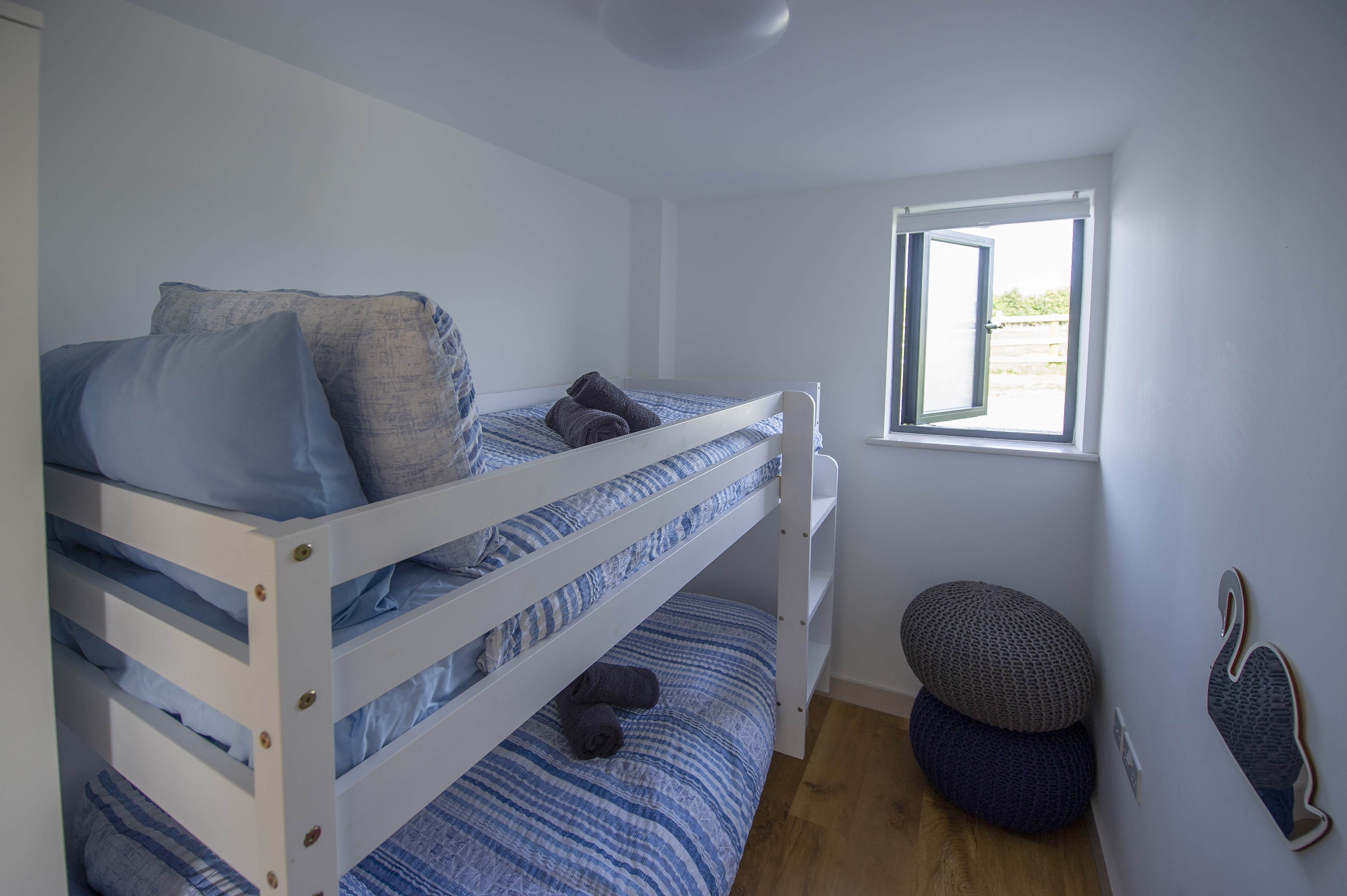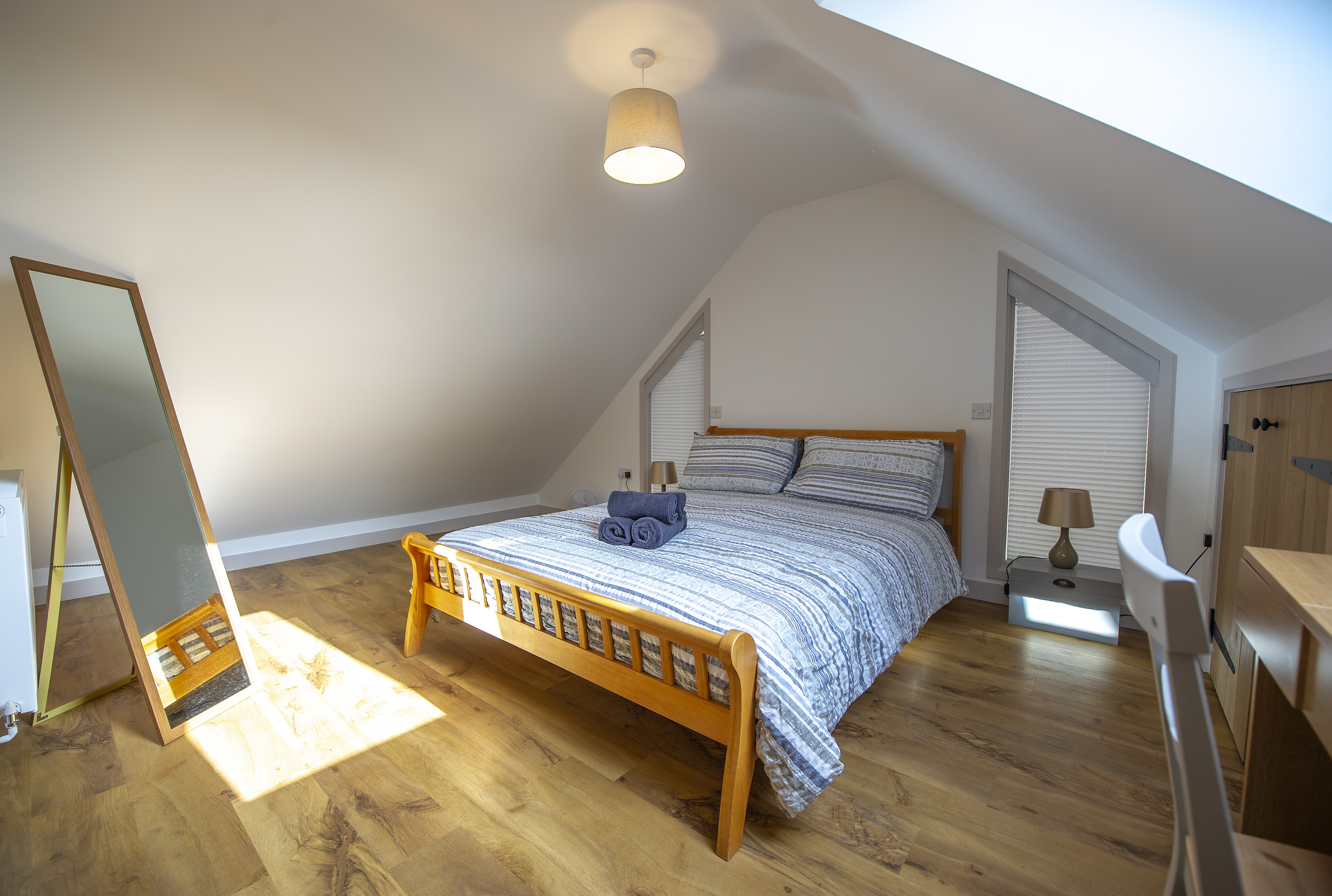 Accommodation includes 1 king size room upstairs with ensuite shower room. Downstairs the king size bedroom and childrens bedroom (2’6 bunk beds) share a family wet room.